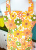 DESCRIPTION: Handmade, fully adjustable, full length, woman’s or man's pinny. Orange, brown, olive green and beige, retro floral pattern with two round cream buttons and two large, semicircular pockets. Pattern placement and button style may vary.