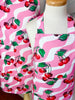 DESCRIPTION: Handmade, fully adjustable, 2- to 6-year-old child’s pinny. Pink, white background with a green and red cherry pattern and a large rectangular pocket.
